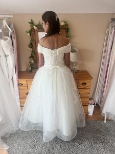 A készleten lévő ruha mérete a fűzőnek köszönhetően 38-42 méretek között állítható, hossza cipővel kb. 174 cm magassághoz tökéletes, rövidebbre könnyedén vágható.